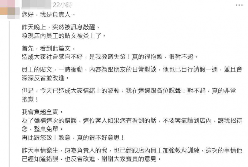 負責人強調,他將負起全責,為了彌補錯誤,願意招待陳小姐整桌免費吃,「在此跟您致上歉意,真的很不好意思!昨天事情發生,身為負責人的我,也已經跟店內員工加強教育訓練,這次的事情他已經知道錯誤,也反省改進,謝謝大家寶貴的意見。」