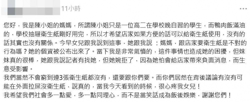 一位自稱是陳小姐母親的網友也在底下留言,她的女兒是在學校晚自習的高二學生,由於鴨肉飯比較油,教室抽屜衛生紙剛好用完,才希望店家如果方便的話可以附上衛生紙,若沒有也沒關係,怎料女兒卻被公審並公開個資,女兒更詢問她「跟店家要衛生紙是不對的行為嗎?」讓她相當氣憤。